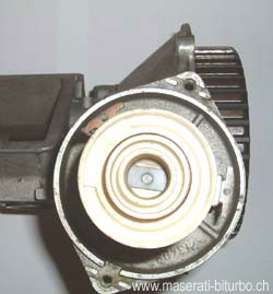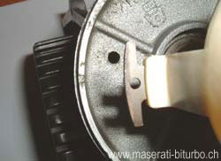 die Einstellbezugsbohrung auf der Riemenscheibe um exakt 180° versetzt